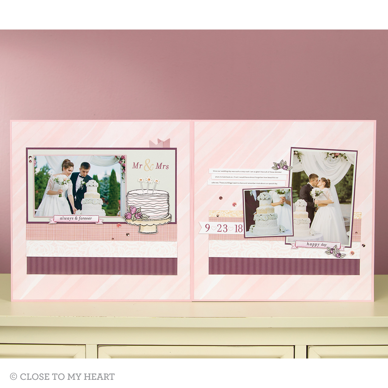 How sweet is this same cake stamp used as an embellishment on this wedding page layout.